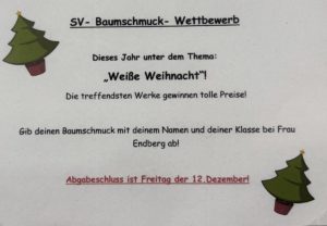 Gebt bis zum 12.12.2025 eueren Baumschmuck zum Thema „Weiße Weihnacht“ bei Frau Endberg ab.
