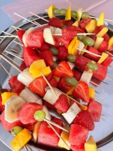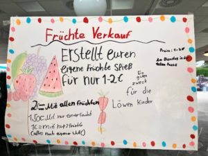 Aus eigener Idee und Organisation heraus hat die Schülergruppe Obstspieße auf dem Pausenhof verkauft. Der Erlös von über 60 Euro wird an die Stiftung Löwenkinder gespendet.